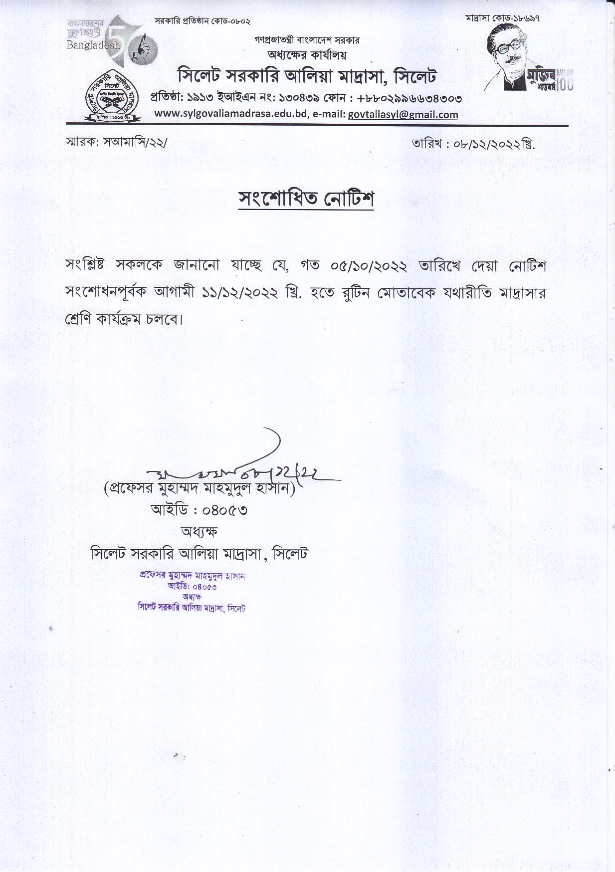 শ্রেণি কার্যক্রমের সংশোধিত নোটিশ-২০২২