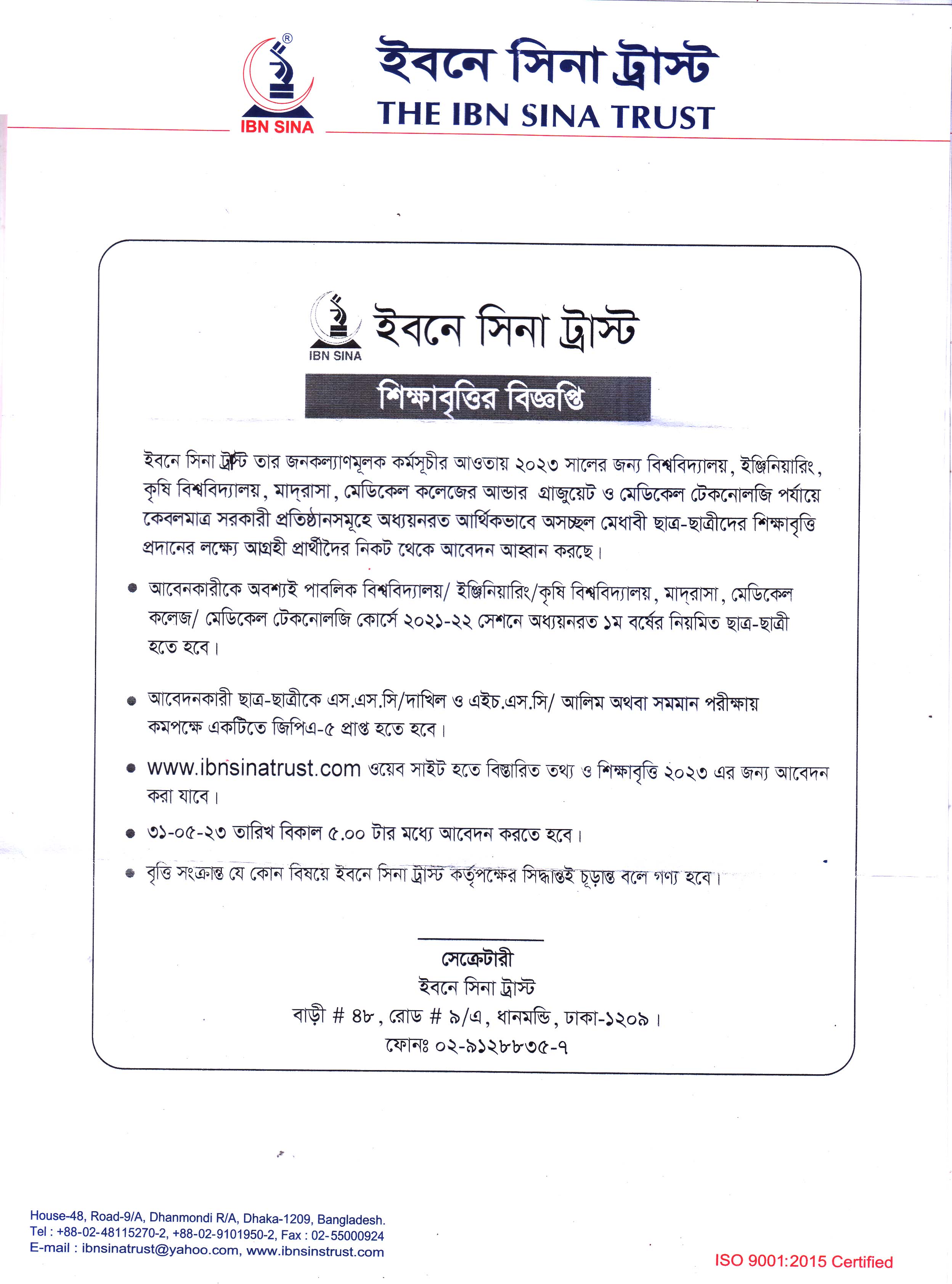 ইবনে সিনা শিক্ষাবৃত্তির আবেদনের নোটিশ-২০২৩