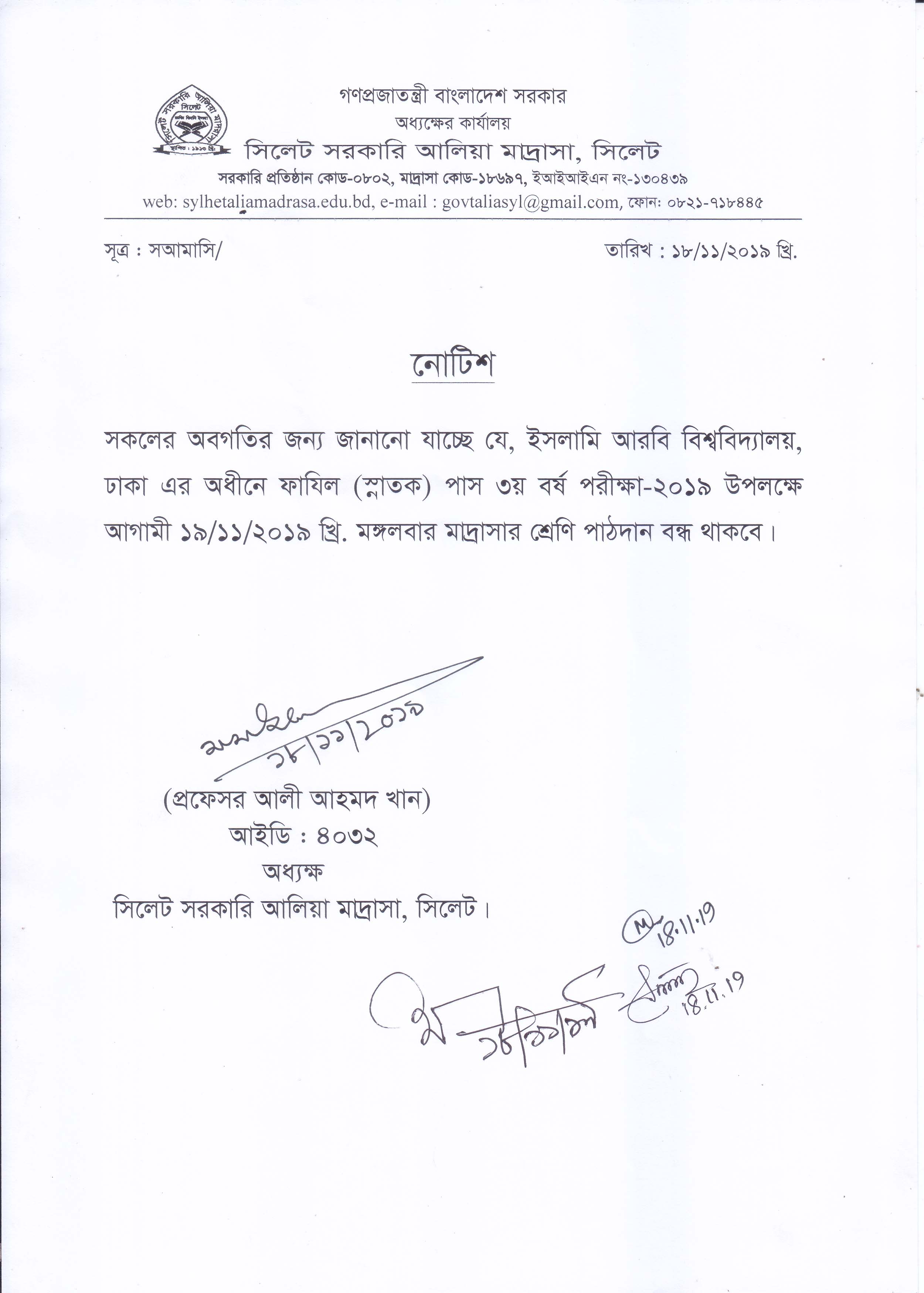19.11.2019 তারিখে মাদ্রাসার শ্রেণি পাঠদান বন্ধের নোটিশ